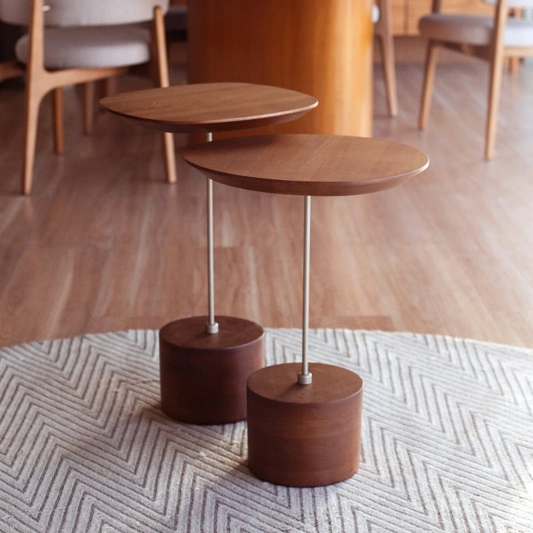 Mesa lateral com design contemporâneo e tampo em madeira em haste metálica.