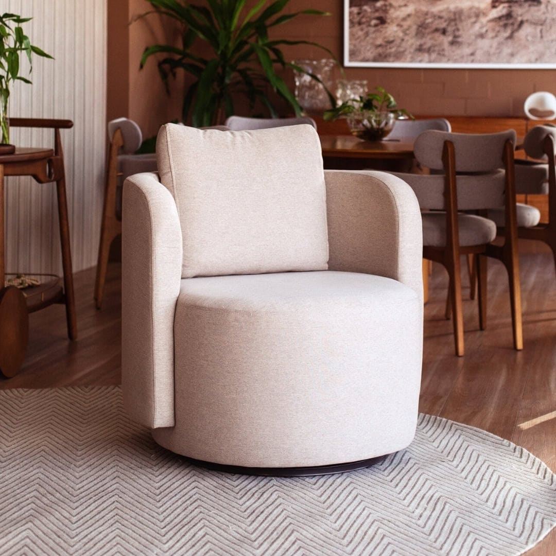 Poltrona giratória com formato orgânico, suporte rotativo na parte interna, assento com percintas elásticas, mola espiral e espuma D28 Soft contínua.