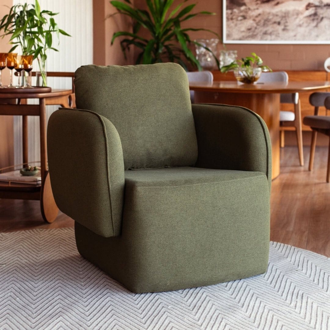 Poltrona giratória com formato orgânico, suporte rotativo na parte interna, assento com percintas elásticas, mola espiral e espuma D28 Soft contínua.